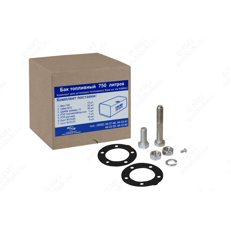 Болт М12х30- 20шт., болт М12х70 — 5шт., винт М5 48/16 — 10шт., гайка М12 — 30 шт., коробочка под фурнитуру — 1шт., прокладка датчика указателя топлива — 1шт., прокладка топливозаборника — 1шт.,шайба М12 гровера — 30шт.