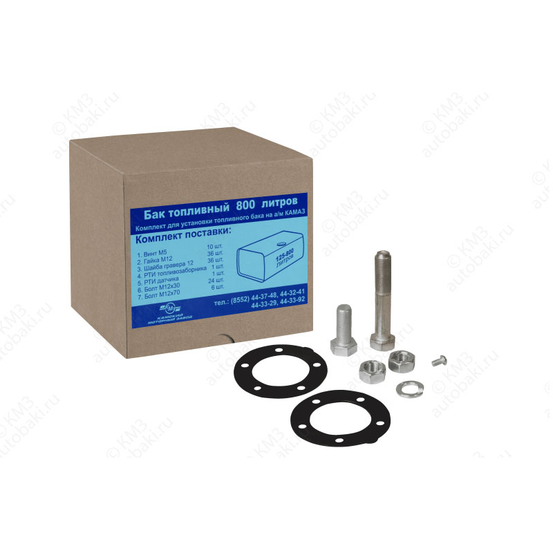 Болт М12х30- 24шт., болт М12х70 — 6шт., винт М5 48/16 — 10шт., гайка М12 — 36 шт., коробочка под фурнитуру — 1шт., прокладка датчика указателя топлива — 1шт., прокладка топливозаборника — 1шт., шайба М12 гровера — 36шт.